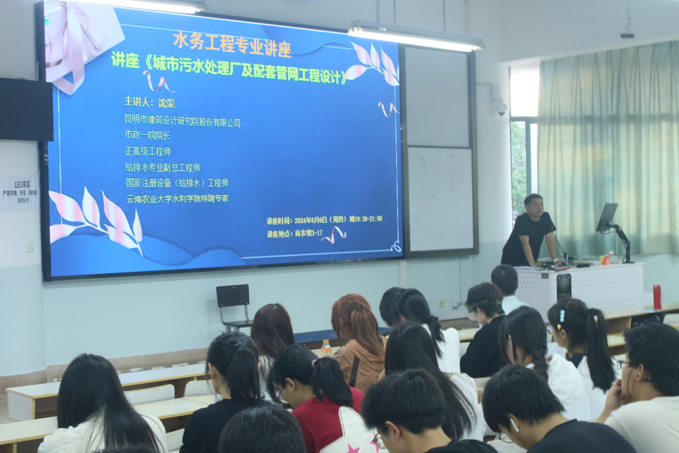2024年6月4日,昆明市建筑设计研究院股份有限公司市政一院经理、正高级工程师沈荣专家受邀为伟德国际1946源于英国水务工程专业师生开展了主题为“城市污水处理厂及配套管网工程设计”的专题讲座。