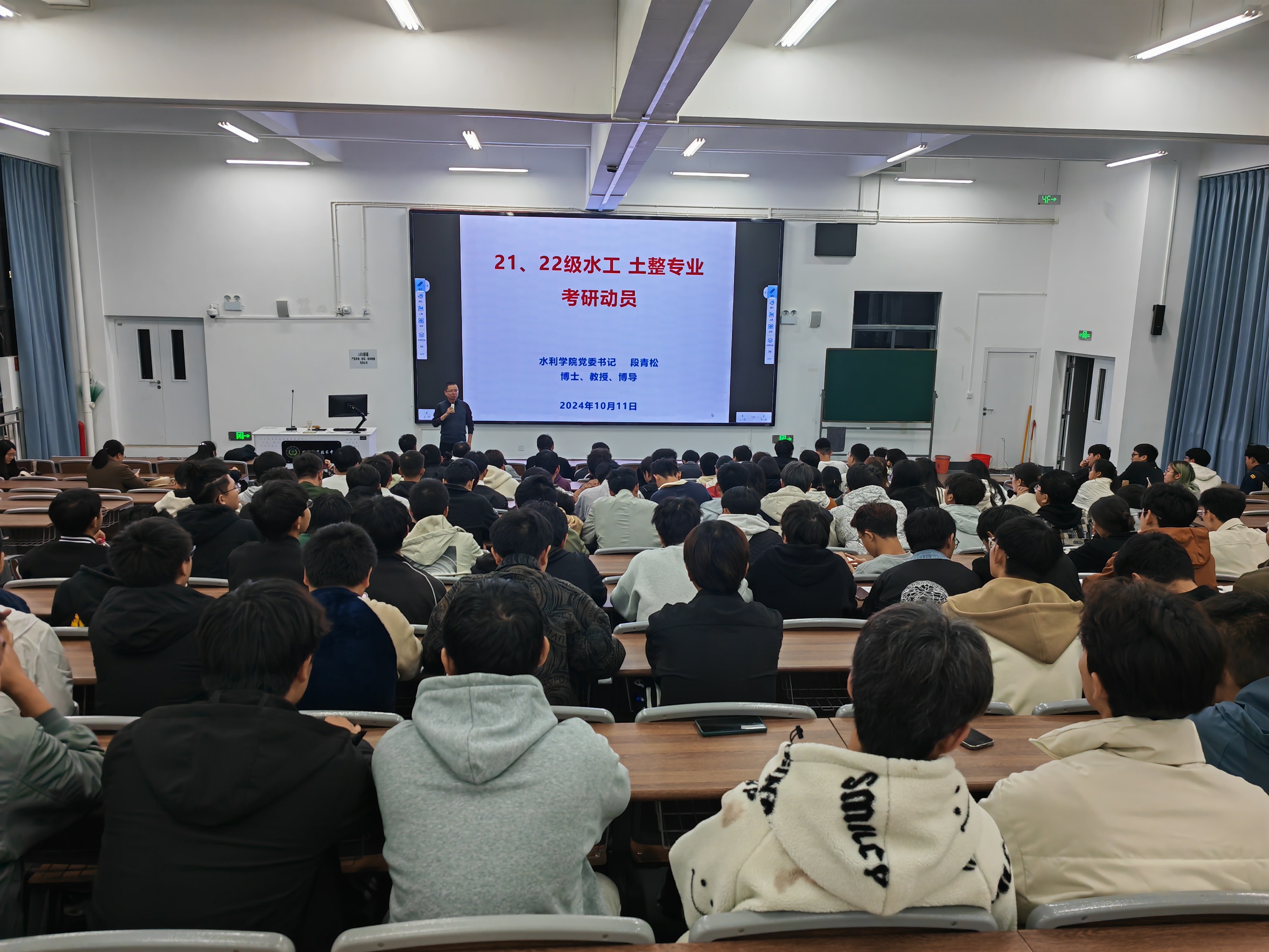 段青松书记针对水工和土整专业开展了考研动员工作,段书记从为什么要考研、如何选择志愿、如何备考三方面进行指导,在互动环节,在场的同学都提出了自己的备考疑惑,段书记进行耐心的解答。最后祝考研的同学成功上岸。